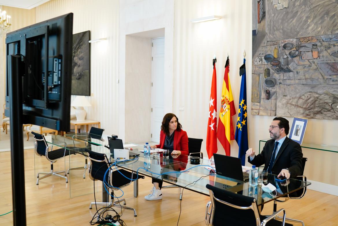 Durante el encuentro telemático con empleados públicos, al que también ha asistido el consejero de Hacienda y Función Pública, Javier Fernández-Lasquetty, se ha hecho balance de los principales resultados obtenidos en materia de teletrabajo durante estos meses de confinamiento.