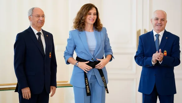 La presidenta de la Comunidad de Madrid, Isabel Díaz Ayuso, ha recibido hoy, en la Real Casa de Correos, la Insignia de Oro de la Real Federación Española de Karate y Disciplinas Asociadas que le han entregado su presidente, Antonio Moreno, y el presidente de la Federación Madrileña, Antonio Torres.