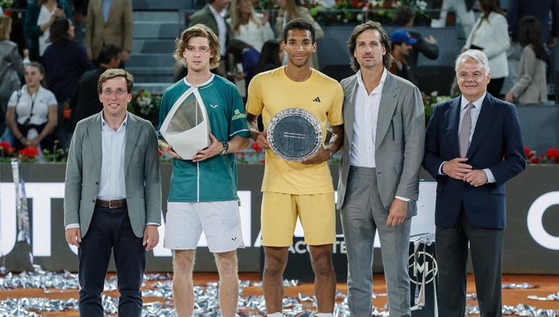 El alcalde de Madrid, José Luis Martínez-Almeida, ha entregado esta noche al tenista ruso Andrey Rublev el trofeo de campeón del Mutua Madrid Open 2024, junto al director del torneo, Feliciano López, y el presidente de Mutua Madrileña, Ignacio Garralda.