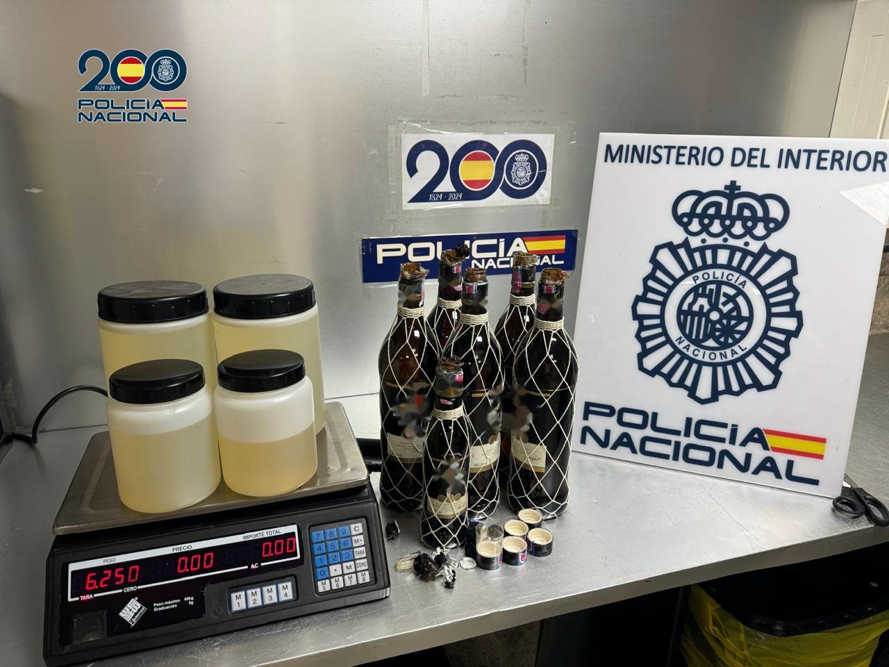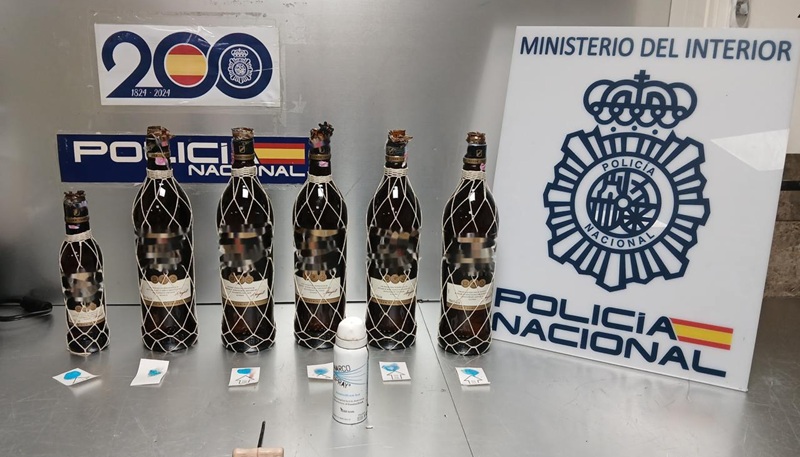 Agentes de la Policía Nacional han detenido a un hombre que portaba más de 6 kilogramos de cocaína líquida oculta en el interior de botellas de bebidas alcohólicas que transportaba en sus maletas.