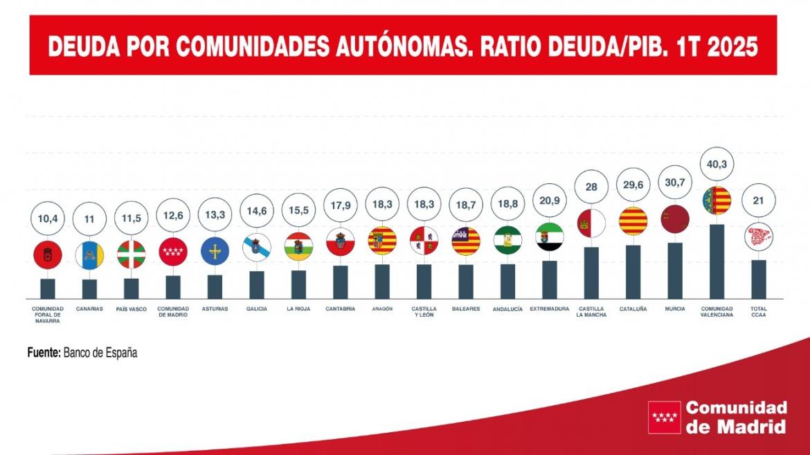 La Comunidad de Madrid vuelve a reducir su deuda en relación al Producto Interior Bruto (PIB) en el primer trimestre de 2025 para seguir con la menor de España entre …