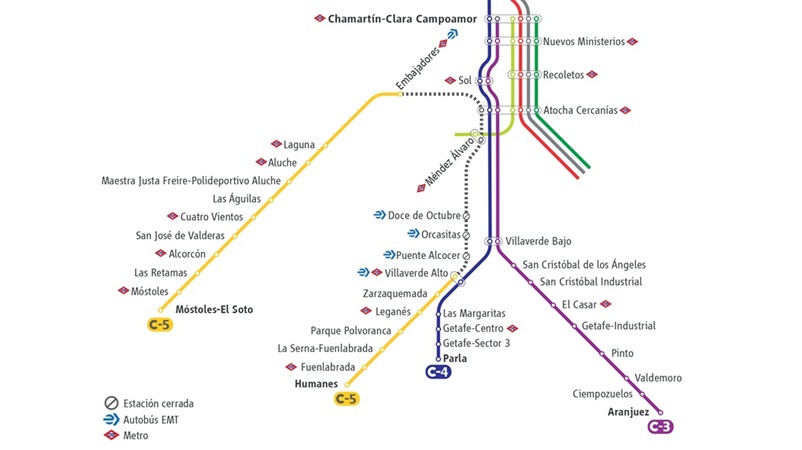 Las líneas C-2, C-7, C-8 y C-10, que utilizan el túnel de Recoletos y también conectan Atocha con Chamartín, darán durante estos meses el servicio habitual, lo que permitirá a los viajeros de las líneas C-3 y C-4 realizar los transbordos que sean necesarios en ambas estaciones.