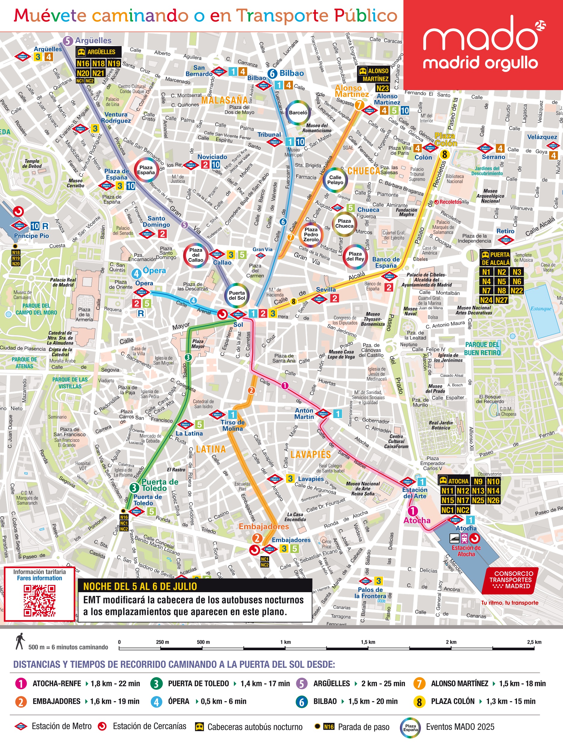 Ya el sábado 5 de julio, día en el que se celebra el desfile-manifestación (que comenzará en la plaza de Carlos V – Atocha a las 19:00 horas y sus carrozas desfilarán por el Paseo de Recoletos y la Castellana hasta llegar a la plaza de Colón), se reforzarán las líneas 1, 2, 3, 4, 5, 6 y 10 de Metro, desde las 17:30 horas hasta el cierre. En concreto, se prevé un incremento de hasta un 50% en algunas líneas como la 4.