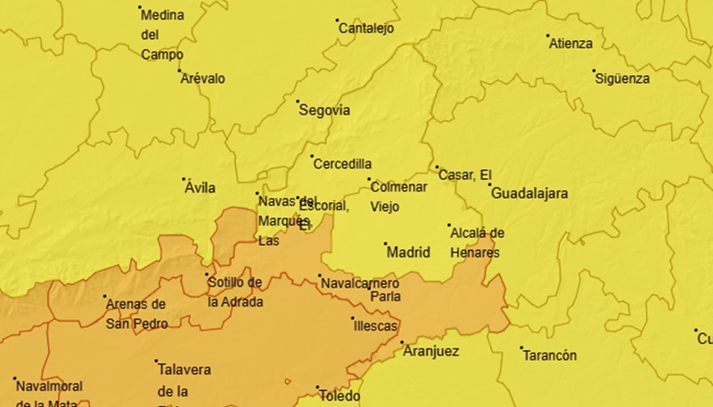 La alerta amarilla por calor afecta a las zonas Metropolitana, Corredor del Henares y Sierra de la región madrileña, mientras que será naranja en las zonas Sur, Vegas y Oeste. Tanto en la zona Metropolitana como en la del Henares se alcanzarán los 38ºC, mientras que en la zona de la Sierra se alcanzarán los 36ºC y en las zonas Sur, Vegas y Oeste los 39ºC.