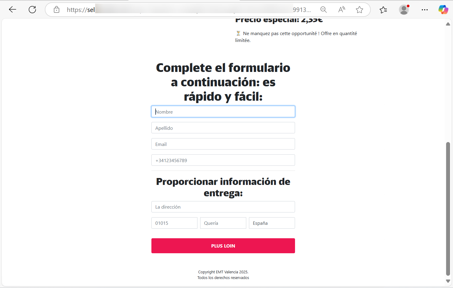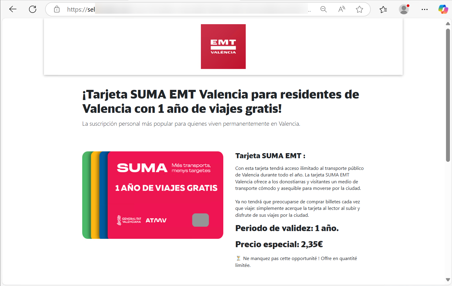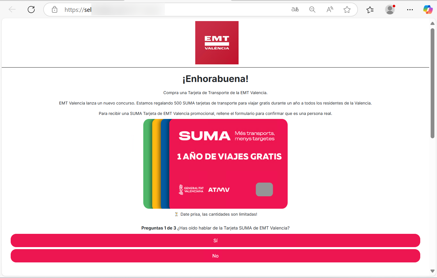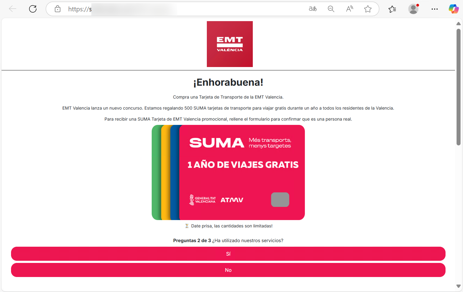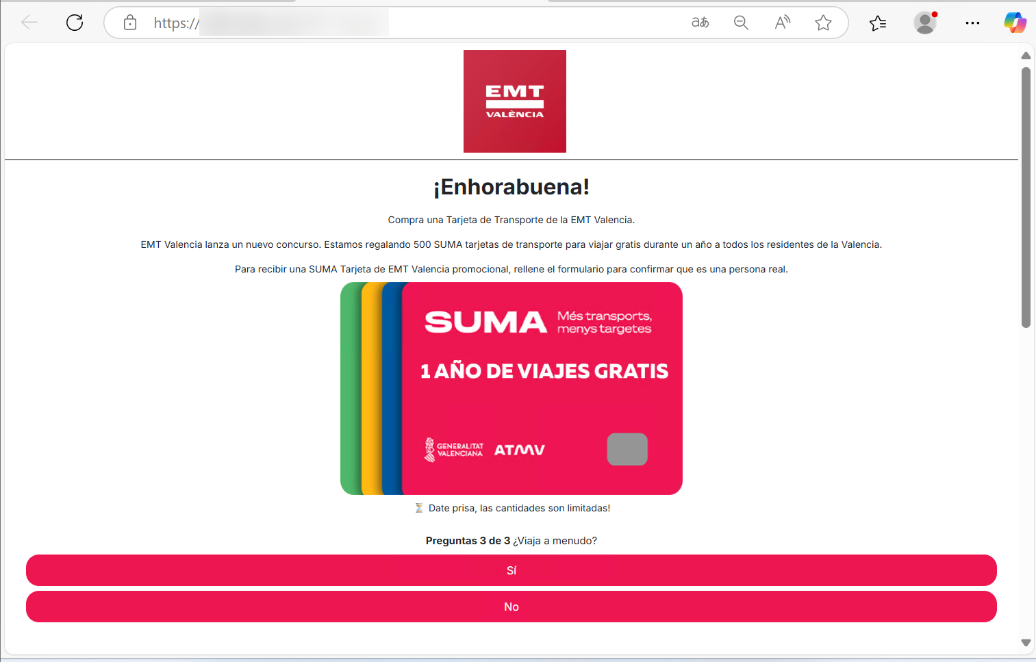 Seguidamente se muestra el proceso que ocurre una vez se ha accedido al enlace que proporcionan estos anuncios fraudulentos. Se observar un sitio web que imita, en este caso, a la EMT de Valencia y en el que se informa de que hay que darse prisa ya que, las unidades son limitadas. Además, se solicita que se rellene un formulario para comprobar que eres una persona real y de esta forma dar sensación de legitimidad.