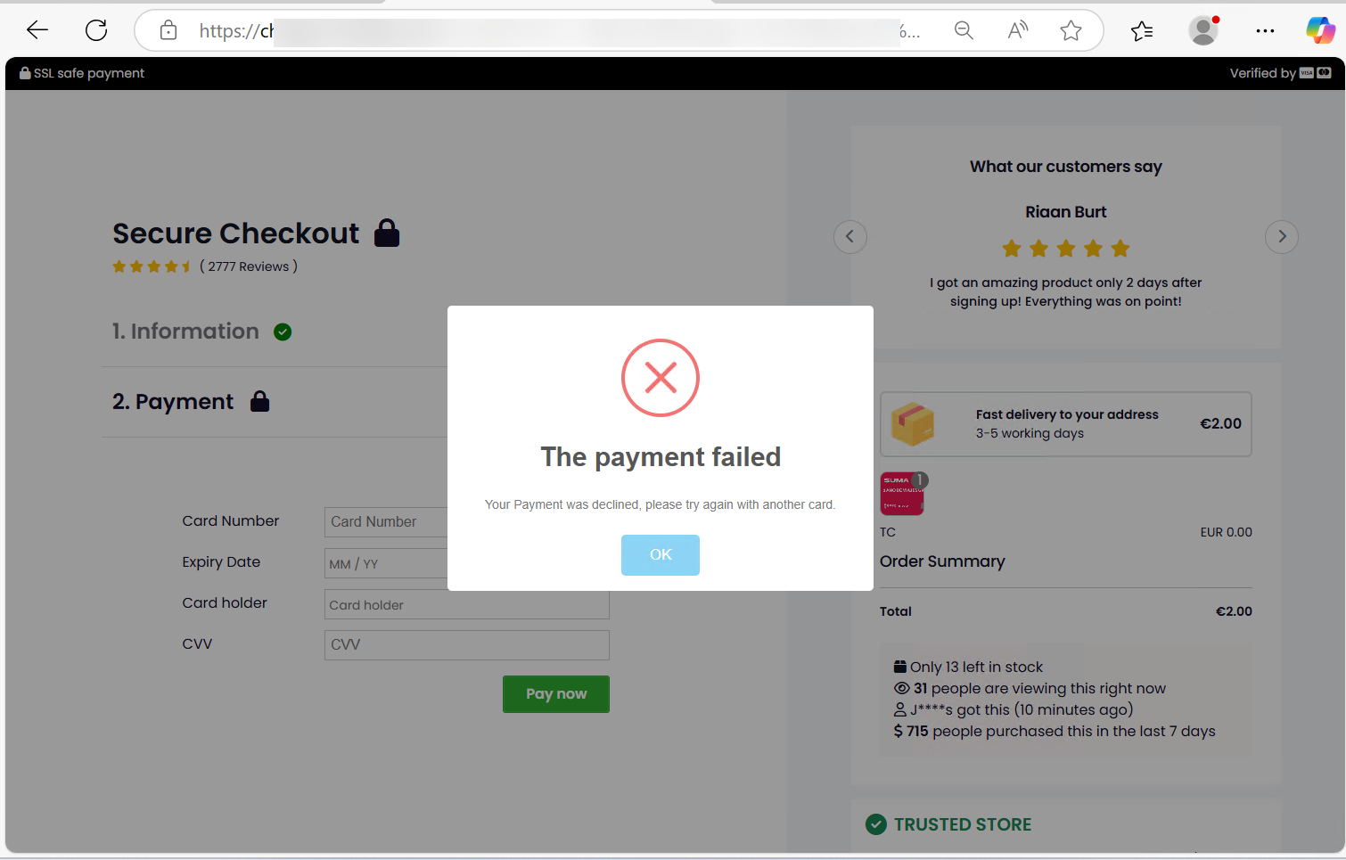 Al pulsar sobre ‘Complete Payment’ se puede observar una ventana emergente que indica que el pago ha sido erróneo ‘The payment failed’.