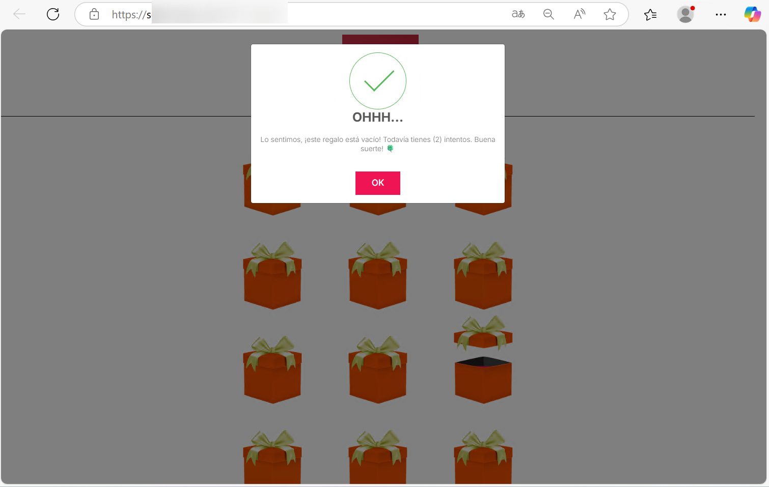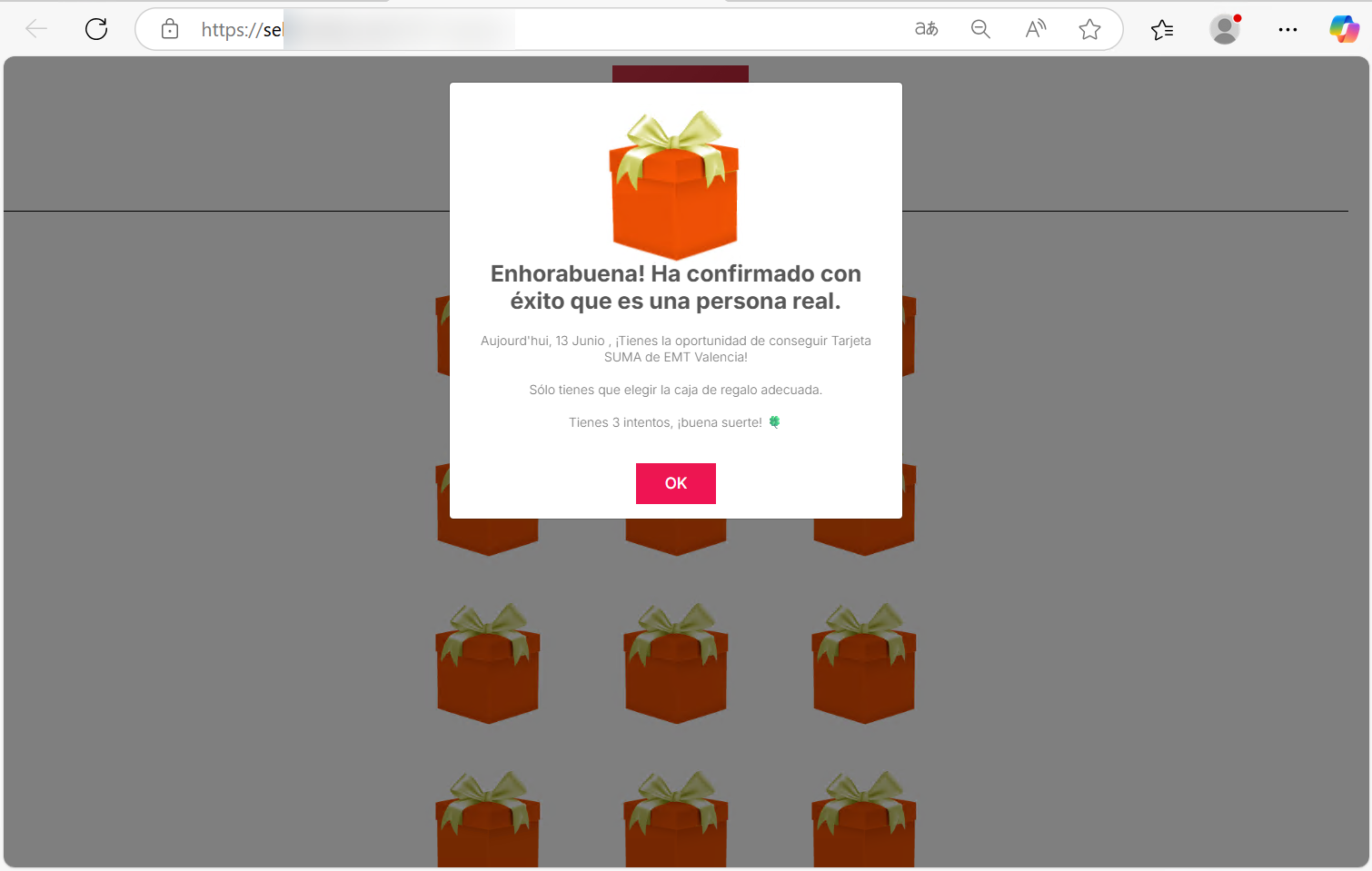 Después de haber respondido a ese cuestionario, aparece una pantalla dando la enhorabuena por haber confirmado que eres una persona real y en este momento, se informa de que tienes supuestamente tres intentos para conseguir la tarjeta de transporte.