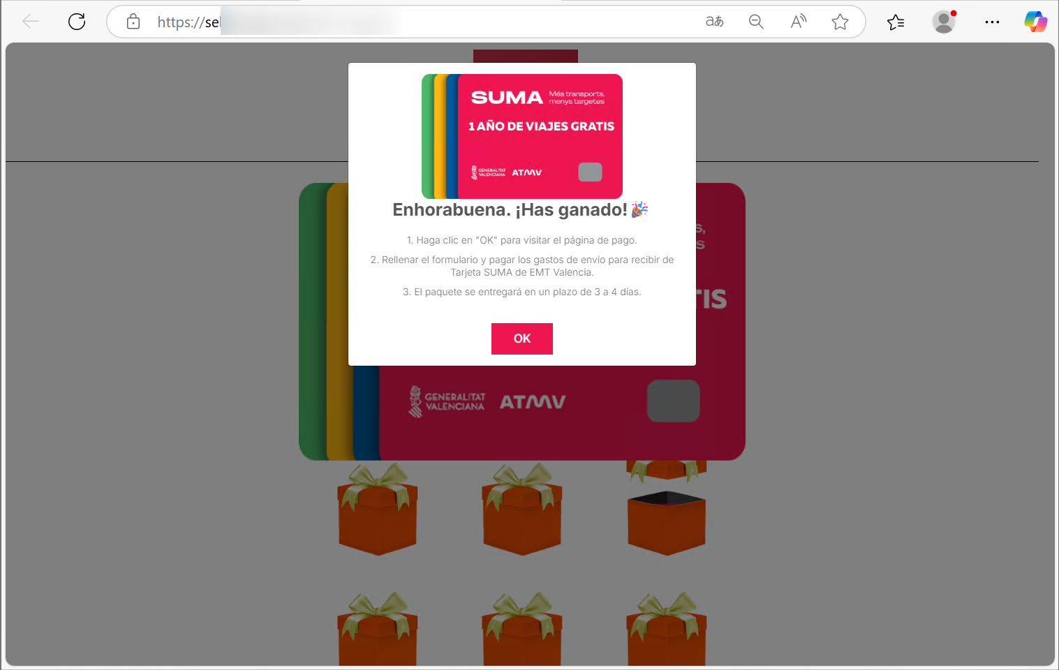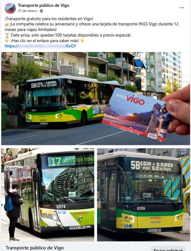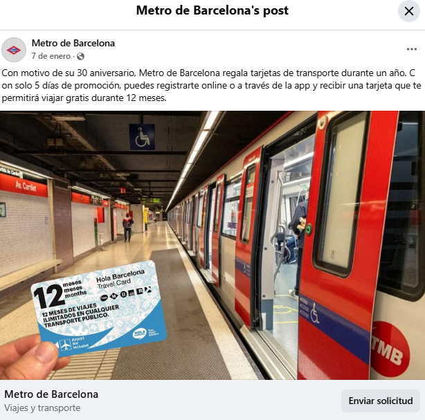 Se ha detectado una campaña de anuncios fraudulentos en páginas de Facebook que anuncian que los usuarios pueden obtener tarjetas de transporte gratuito durante un año con motivo de un aniversario. Apremian a los usuarios a darse prisa en solicitarlas mencionando que hay un número limitado de estas o que la promoción acaba en pocos días.