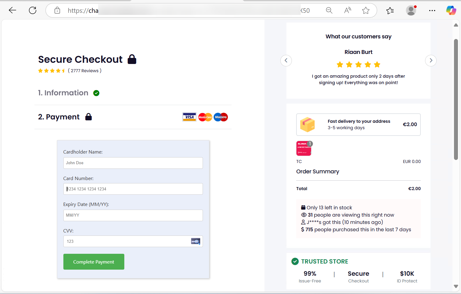 Cuando se ha inicia el proceso para facilitar los datos personales y bancarios, as páginas fraudulentas muestran textos en inglés, español, francés que ya hacen indicar que no es un sitio de confianza. Además de varias valoraciones de cinco estrellas de usuarios en la supuesta pasarela de pago, algo que es inusual.