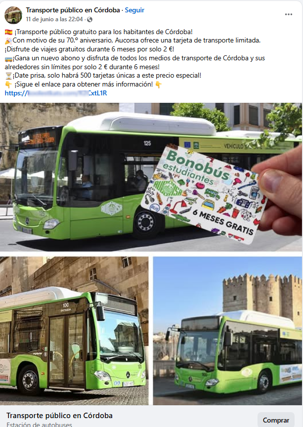 Algunos de los indicativos que nos pueden hacer sospechar de este tipo de anuncios son los enlaces que se incluyen, ya que si los observamos no corresponden a ningún sitio web oficial que tenga que ver con el transporte público de esa localidad. Desconfía de las ofertas y promociones demasiado buenas y verifica en otras fuentes de información oficiales y de mayor confianza si estas son legítimas.