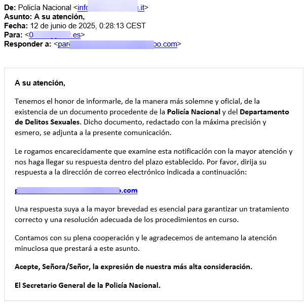 Los usuarios reciben un falso correo de una de estas entidades comunicando una supuesta citación judicial por graves delitos como pornografía infantil o pedofilia, entre otros, y les insta a responder con sus datos personales al mensaje en un plazo de 48 horas bajo amenaza de arresto, divulgación de los supuestos hechos e inscripción en un Registro Nacional de Delincuentes Sexuales en caso de no hacerlo.