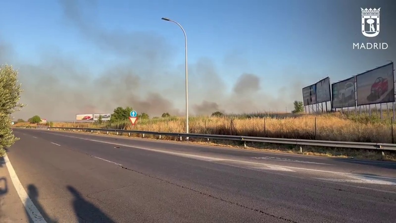 Un incendio de pasto junto a la M-40, cerca del estadio Civitas Metropolitano en el distrito de San Blas-Canillejas y próximo al aeropuerto de Adolfo Suárez Madrid-Barajas y a Coslada, …