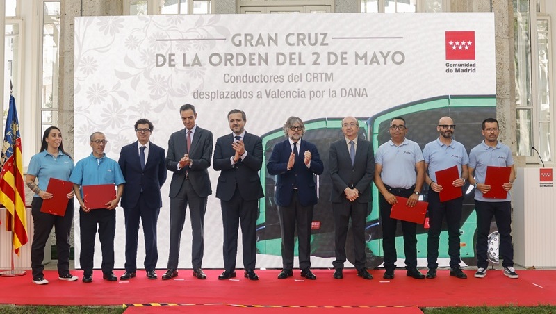 La Comunidad de Madrid ha rendido hoy homenaje a los conductores del Consorcio Regional de Transportes de Madrid (CRTM) que, de forma voluntaria, prestaron servicio en las zonas afectadas por la DANA que asoló la Comunidad Valenciana el pasado mes de octubre. El consejero de Vivienda, Transportes e Infraestructuras, Jorge Rodrigo, ha hecho entrega del diploma que acredita la Gran Cruz de la Orden del Dos de Mayo a todos aquellos que no pudieron recogerlo por encontrarse aún desplazados.