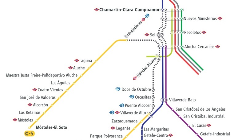 Las líneas C-2, C-7, C-8 y C-10, que utilizan el túnel de Recoletos y también conectan Atocha con Chamartín, darán durante estos meses el servicio habitual, lo que permitirá a los viajeros de las líneas C-3 y C-4 realizar los transbordos que sean necesarios en ambas estaciones.