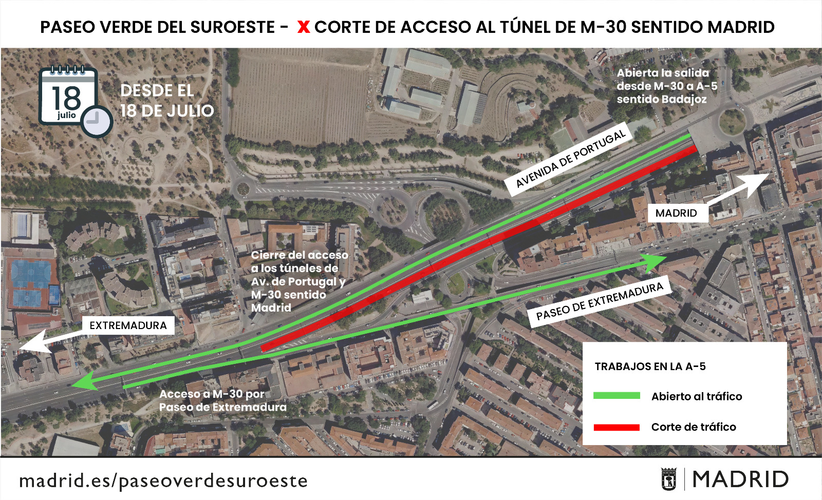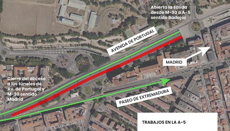 El tráfico en dirección Madrid se desviará por el paseo de Extremadura, para poder acceder de nuevo a la M-30 por los túneles en la avenida del Manzanares y, en superficie, por la avenida de Valladolid hasta el Puente de los Franceses. Se mantendrá abierta en todo momento la salida desde los túneles de M-30 a la A-5 en sentido Badajoz.