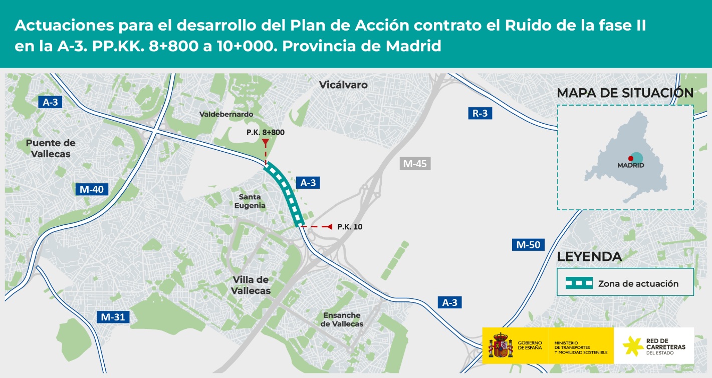 El Ministerio de Transportes y Movilidad Sostenible ha aprobado el expediente de información pública y definitivamente el proyecto de trazado para ejecutar las actuaciones del plan de acción contra el ruido, Fase II, en la autovía A-3, entre los km 8,800 y 10, a su paso por el barrio de Santa Eugenia, en el distrito madrileño de Villa de Vallecas.