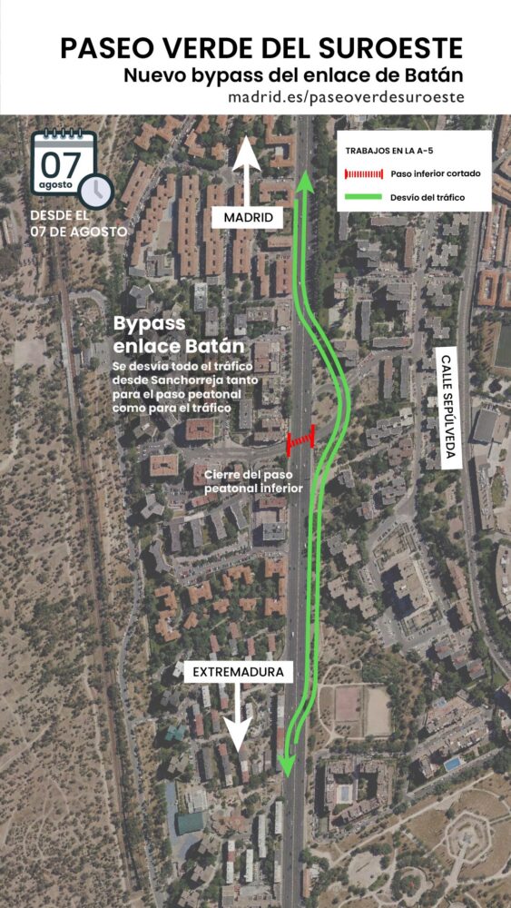 El jueves 7 de a agosto, se pondrá en funcionamiento un nuevo desvío de tráfico en la zona sur, desde Sanchorreja (P.K. 5+100 de la A-5) hasta el nuevo bypass del enlace con Batán, quedando cortado ya de forma permanente el paso inferior existente tanto para el paso peatonal como para el tráfico. Los vehículos podrán cruzar del barrio de Lucero al de Batán y acceder a la A-5 tanto por la calle de Carlina como por la de Villagarcía. El itinerario peatonal también se verá afectado al cortarse el paso inferior, siendo el servicio especial de EMT Madrid de los barrios de Batán y Lucero (SE 3) la mejor alternativa para los vecinos.
