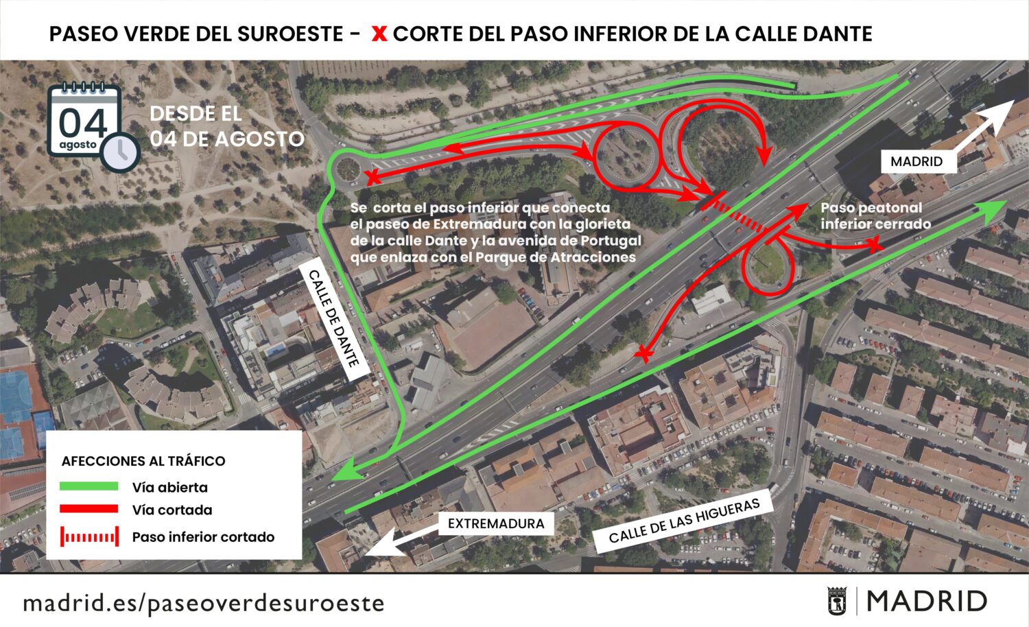 A partir del lunes 4 de agosto, se cortará el paso inferior que conecta el paseo de Extremadura con la glorieta de la calle Dante y la avenida de Portugal, que enlaza con el desvío al Parque de Atracciones. Este corte se produce para comenzar los trabajos de construcción del nuevo bypass (desvío de todo el tráfico de la A-5 hacia el norte) del Parque de Atracciones, que se abrirá en el mes de septiembre para demoler el enlace existente y proseguir con la ejecución del futuro túnel. El itinerario peatonal también se verá afectado, ya que el paso peatonal inferior se cerrará, siendo la alternativa la glorieta de avenida de Portugal.