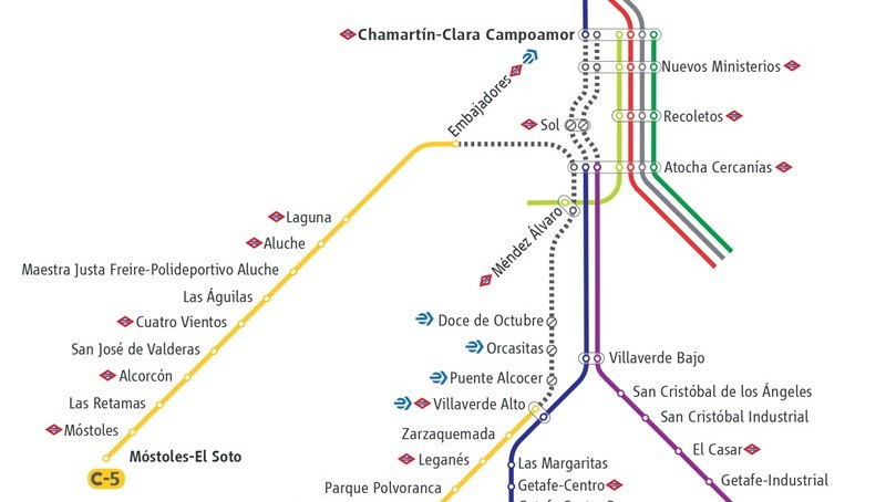 Las líneas C-2, C-7, C-8 y C-10, que utilizan el túnel de Recoletos y también conectan Atocha con Chamartín, ofrecen durante estos meses el servicio habitual, lo que permite a los viajeros de las líneas C-3 y C-4 realizar los transbordos que sean necesarios en ambas estaciones.