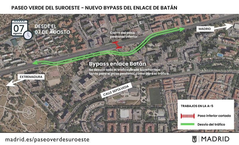 Para continuar con la ejecución del soterramiento de la autovía del A-5 y la creación del Paseo Verde del Suroeste, a partir de este jueves 7 de agosto se pondrá en funcionamiento un nuevo desvío de tráfico en la zona sur, desde Sanchorreja (P.K. 5+100 de la A-5) hasta el nuevo baipás del enlace con Batán, quedando cortado ya de forma permanente el paso inferior existente tanto para el paso peatonal como para el tráfico.