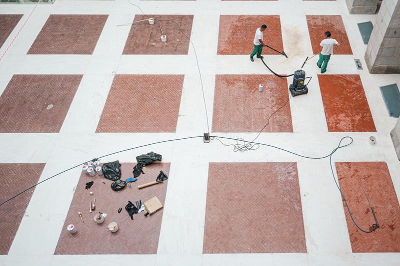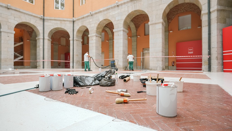 En el caso del suelo cerámico, las obras han consistido en decapar el barniz para recuperar la superficie de ladrillo original con un producto especial que reblandece el material para poder retirarlo con una espátula. Posteriormente se ha limpiado y aclarado con agua a baja presión para eliminar las impurezas.