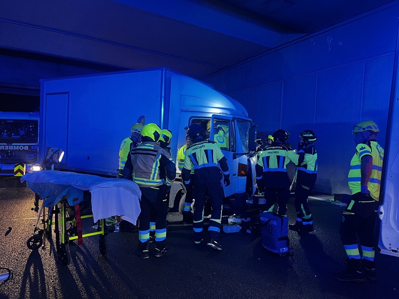 En circunstancias que aún se investigan, han colisionado una furgoneta VTC y un camión, cuyo conductor de este último, de 58 años, ha tenido que ser rescatado por los Bomberos del Ayuntamiento de Madrid.