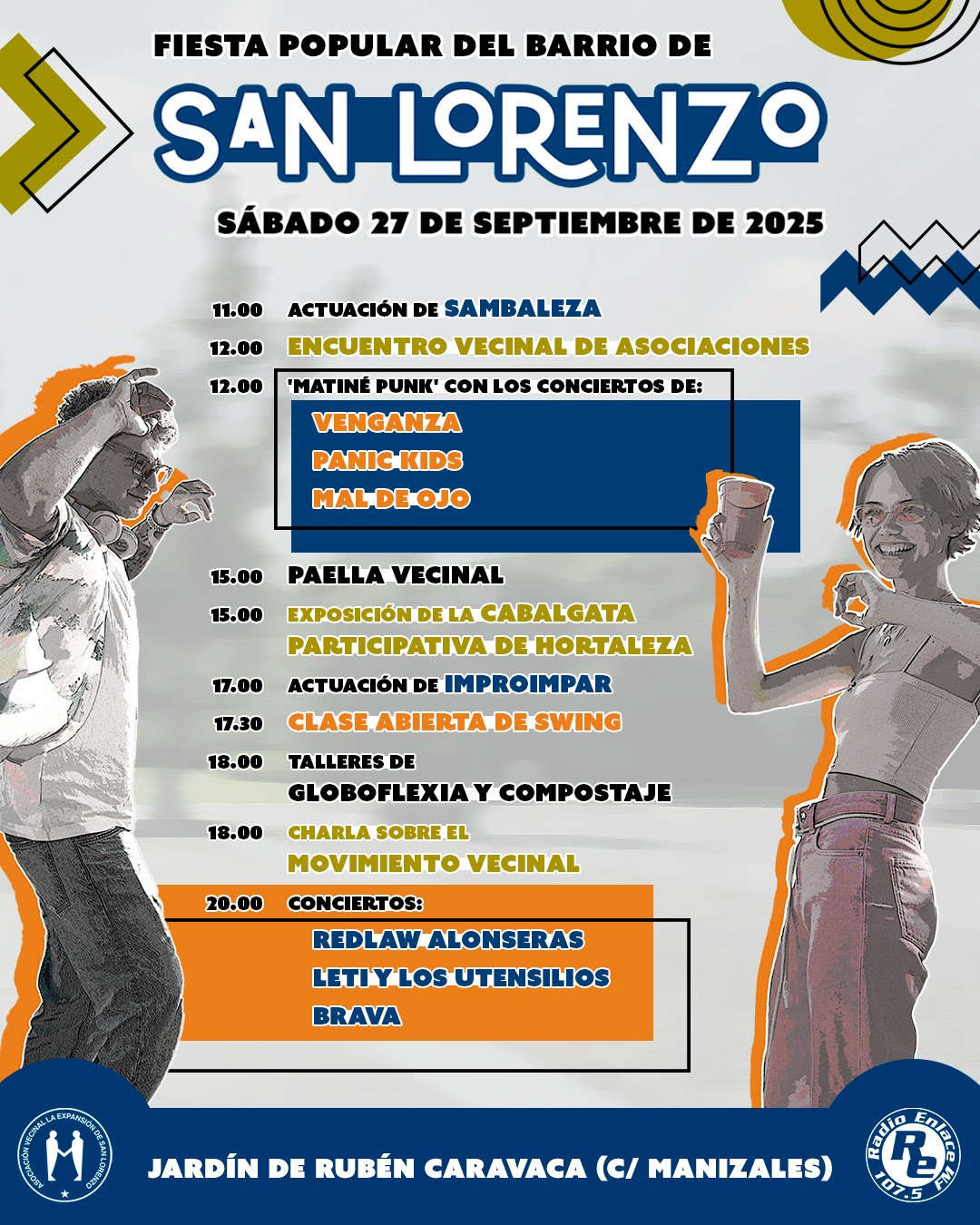 La nueva edición de las fiestas del barrio de San Lorenzo arrancará al ritmo de la batucada Sambaleza a las 11:00, para dar paso después a una ‘matiné punk’ con la actuación del grupo zaragozano Venganza y las bandas Panic Kids y Mal de Ojo. De 12:00 a 14:00, el jardín de Rubén Caravaca acogerá también un encuentro vecinal en el que participarán una quincena de entidades de Hortaleza para dar a conocer su trabajo al vecindario. A las 15:00 habrá una paella popular y se instalará una exposición con imágenes históricas de la Cabalgata Participativa de Hortaleza, que ha cumplido 50 años.