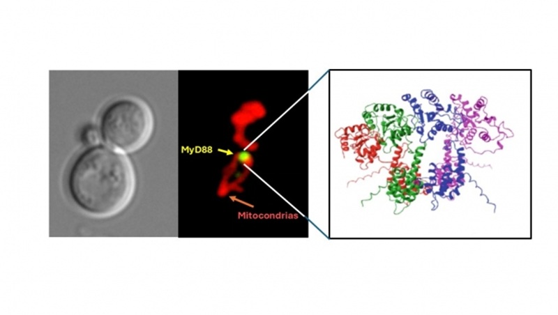 MyD88 posee dos dominios de autoensamblaje independientes, como si fueran dos piezas de puzle distintas unidas entre sí: una, un dominio llamado “TIR” con el que interacciona con los receptores TLR y otra, un dominio llamado “Death” (común en proteínas que regulan la muerte celular), con el que interacciona con proteínas efectoras que poseen este mismo dominio. Los resultados publicados muestran que el comportamiento observado en levadura depende exclusivamente del dominio “Death”.