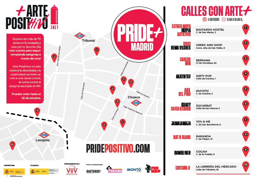 En Madrid, el público que recorra las calles del centro podrá disfrutar de las obras de más de una decena de artistas, entre los que se encuentran destacados creadoras y creadores como Inopia, Artktovi, Esther Moya, Jamalamaja o Nat N Blanc, diferentes estilos que se conectan y dialogan entre sí para construir un discurso colorido y diverso sobre la historia y el presente del VIH y las diferentes formas que puede adoptar el estigma. A partir de las doce de la mañana, y hasta las siete de la tarde, los y las participantes estarán interviniendo en espacios comerciales de los barrios de Chueca, Malasaña y Lavapiés.