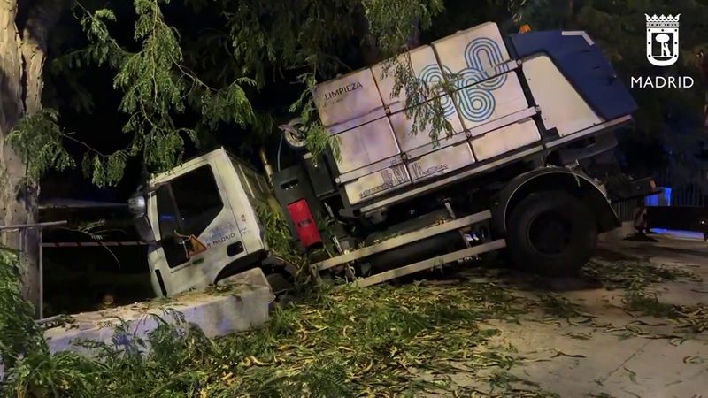 Esta madrugada de martes, 7 de octubre, los Bomberos del Ayuntamiento de Madrid han llevado a cabo una compleja maniobra de rescate para recuperar una baldeadora de limpieza que se precipitó por la Cuesta de la Vega, en pleno centro de la capital. El vehículo, de gran tonelaje, perdió el control y acabó encajado entre dos árboles, suspendido parcialmente sobre una zona ajardinada de las conocidas revueltas.