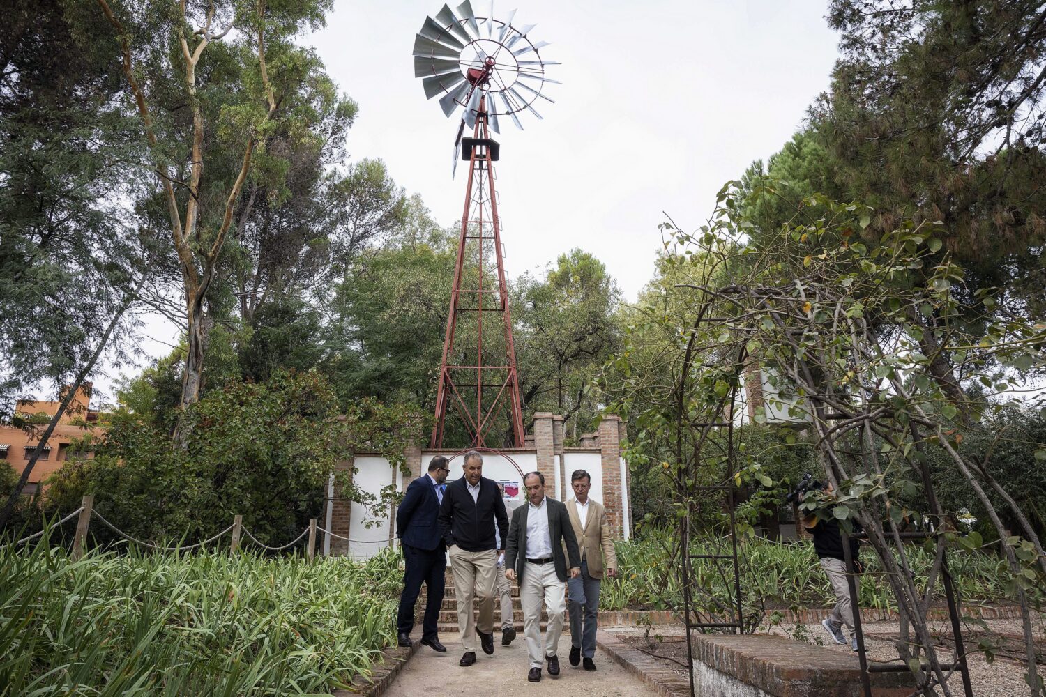 El delegado de Urbanismo, Medio Ambiente y Movilidad, Borja Carabante, acompañado del concejal delegado de Limpieza y Zonas Verdes, José Antonio Martínez Páramo, y de la concejala de San Blas-Canillejas, Almudena Maíllo, ha comprobado esta mañana el resultado de la rehabilitación de estos elementos simbólicos y ha anunciado la organización de una gran exposición sobre la Quinta de los Molinos en 2026, coincidiendo con su primer centenario.