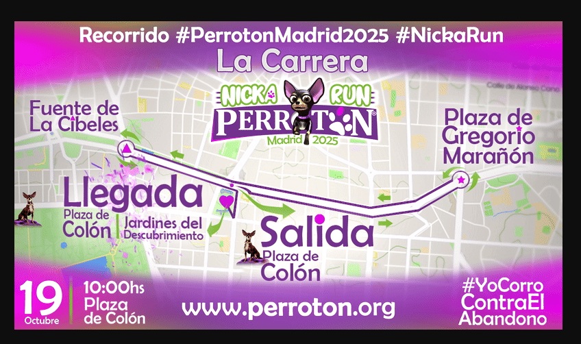 Recorrerá lugares tan emblemáticos como el Paseo de la Castellana, Plaza de Emilio Castelar, Plaza de Gregorio Marañón, Paseo de Recoletos, Fuente de Cibeles y la Calle Goya hasta llegar a la meta. En sus trece anteriores ediciones, Perrotón Madrid Nicka Run ha contado con una participación de más de 54.500 perros acompañados de sus dueños.