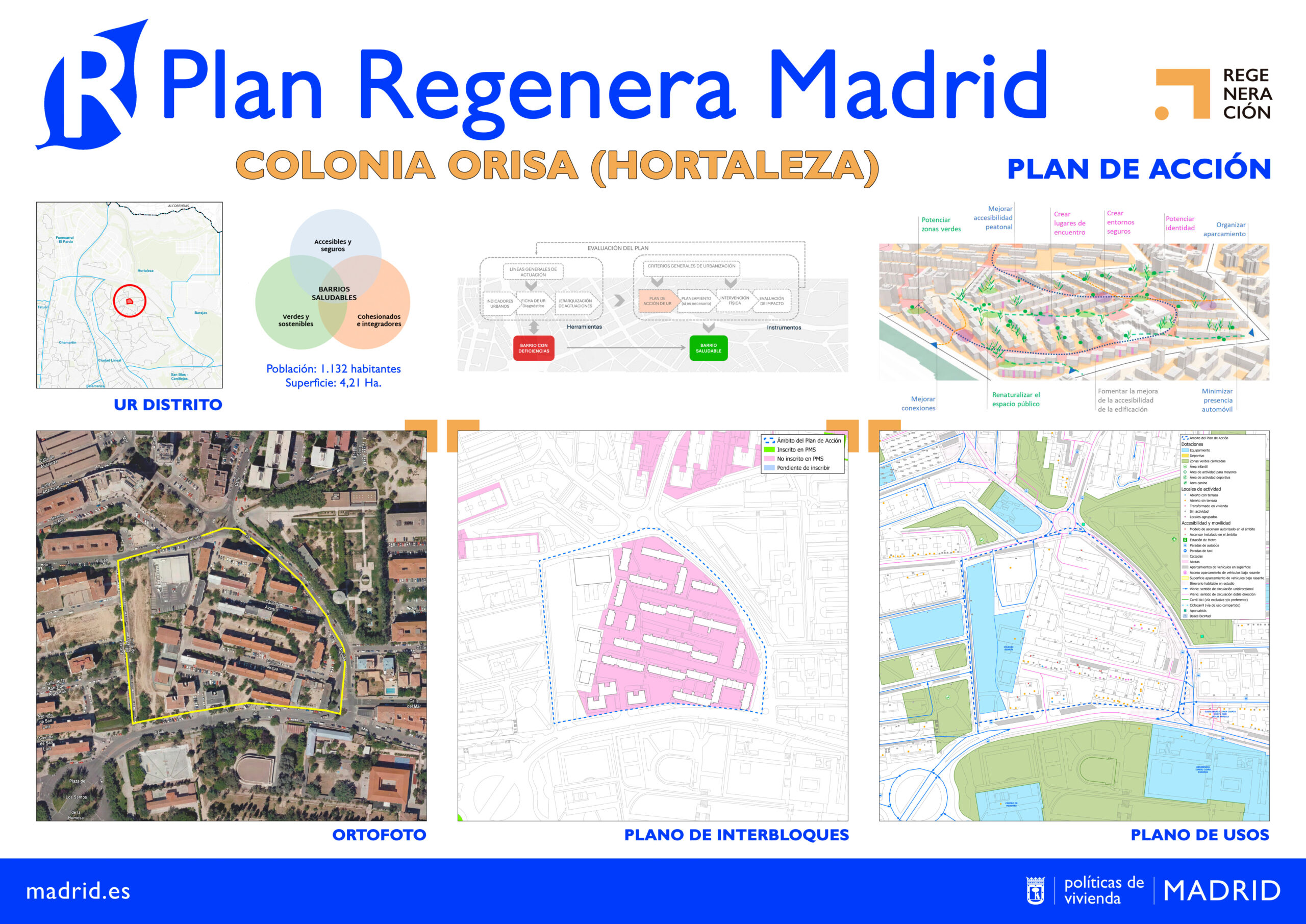 Se trata de una de las primeras incluidas dentro del Plan Regenera Madrid, el instrumento estratégico municipal destinado a mejorar los entornos residenciales más degradados de la capital y en los que hasta ahora no se ha podido actuar. La Colonia Orisa, construida a mediados de los años 60, cuenta con 1.132 habitantes, 531 viviendas y una superficie total de 42.086 metros cuadrados, de los cuales el 99,8 % está declarado Zona de Especial Transformación Urbana.