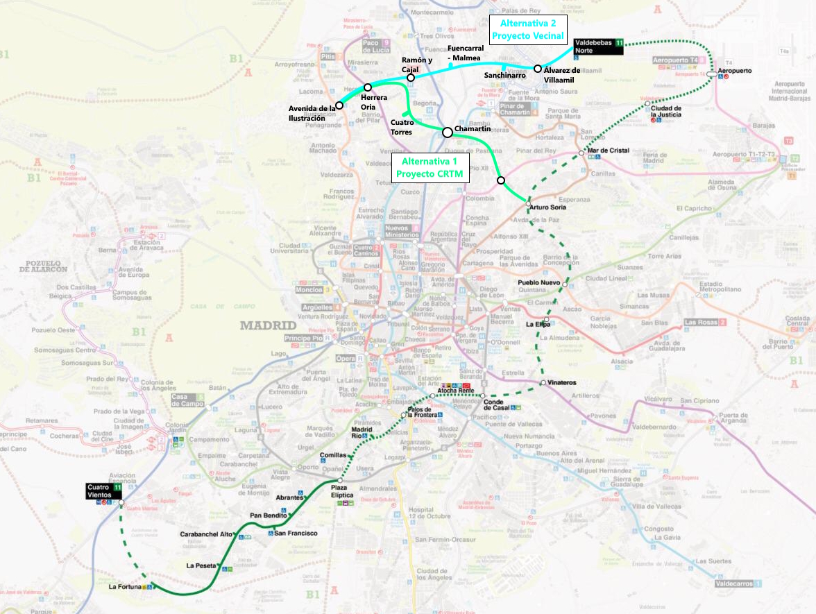En consecuencia, las asociaciones proponen retomar el diseño original de la Línea 11, elaborado por el Consorcio Regional de Transportes de Madrid (CRTM) en 2006, que planteaba un recorrido semicircular desde Plaza Elíptica hasta Avenida de la Ilustración, pasando por Atocha, Conde de Casal, Ciudad Lineal, Arturo Soria y la estación de Chamartín.