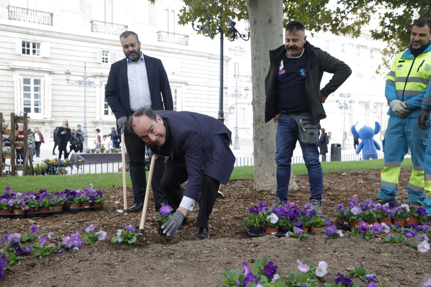 El delegado de Urbanismo, Medio Ambiente y Movilidad, Borja Carabante, y el concejal del distrito de Centro, Carlos Segura, han visitado esta mañana la plaza de Oriente, donde han presentado la campaña de plantación de flor de temporada otoño-invierno, que se concretará con la plantación de 769.291 unidades vegetales.