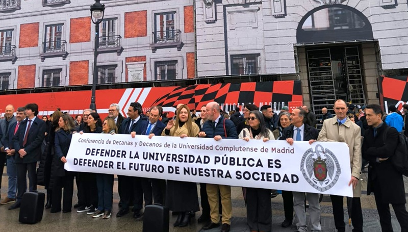 Los decanos y decanas de las 26 facultades de la Universidad Complutense de Madrid (UCM) se concentraron este viernes, 14 de noviembre de 2025, en la Puerta del Sol para reivindicar la defensa de la universidad pública, a la que consideran un elemento esencial para el progreso democrático, la cohesión social y el desarrollo económico de la región.