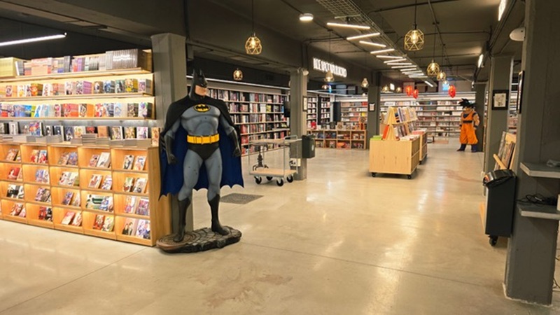 Con más de 600 m² de espacio interior y 200 m² de exteriores, Arkham Storage combina librería, centro logístico y plataforma de venta online en un mismo enclave. El resultado es un espacio único donde conviven la estética industrial, una exposición cuidada por secciones —superhéroes, autor, nacional, cómic europeo, infantil, manga y merchandising— y las nuevas áreas de preparación de pedidos y sistemas de envío.