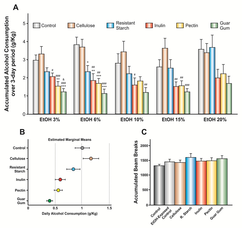 Figura 4A muestra de forma clara cómo las fibras altamente fermentables (inulina, pectina y goma guar) reducen de manera muy notable —entre un 40 % y un 60 %— el consumo voluntario de alcohol en comparación con el grupo control y con las fibras no fermentables. Figura 4B presenta las medias marginales del consumo diario de alcohol, lo que permite visualizar de manera integrada el efecto global de cada tipo de fibra a lo largo de todo el periodo experimental. Estas dos imágenes resumen de manera directa y comprensible el resultado central del estudio: determinados tipos de fibra producen cambios en la microbiota intestinal que se asocian con una reducción significativa de la ingesta de alcohol.