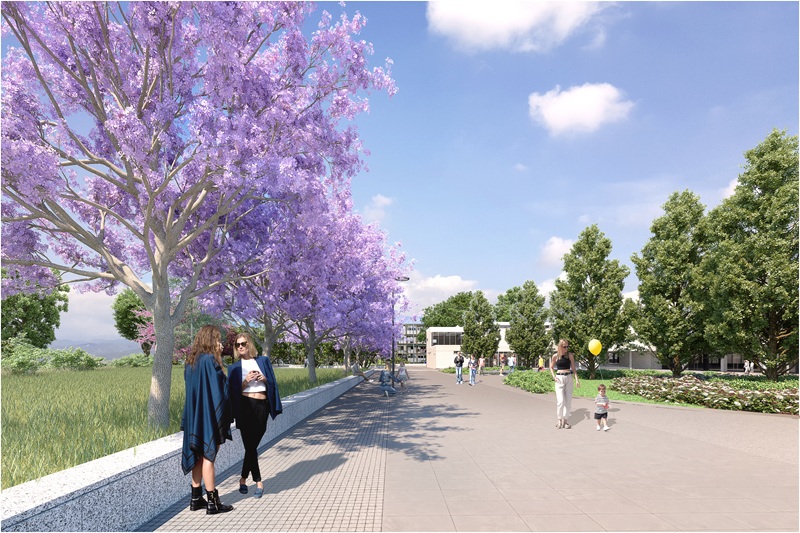 En el diseño de la zona verde se han tenido en cuenta criterios de jardinería sostenible tanto desde el punto de vista del consumo de agua como de la elección de especies vegetales para el incremento y la mejora de la biodiversidad en el entorno urbano. Además, se maximiza la superficie permeable y se emplean pavimentos de tonos claros que contribuyen a mitigar el calentamiento urbano. La actuación incorpora también un sistema propio de drenaje sostenible basado en la infiltración, captación y almacenamiento del agua pluvial, garantizando una gestión más eficiente y responsable de los recursos naturales.