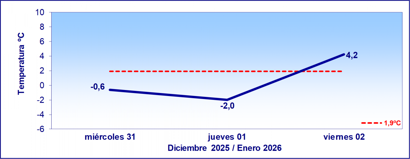 Este martes, 30 de diciembre, se han registrado mínimas de +1,3ºC. De cara al miércoles, 31 de diciembre, las temperaturas mínimas bajarán hasta los -0,6ºC, similar tendencia para el jueves, 1 de enero, con unas mínimas de -2,0ºC, subiendo fuertemente hasta los +4,2ºC el viernes 2. El nivel de alerta se alcanza cuando las temperaturas mínimas previstas para al menos uno de los próximos tres días sean inferiores a 2º, lo que se comunica a los efectos de aplicar las medidas de prevención e información oportunas en el ámbito de sus competencias.
