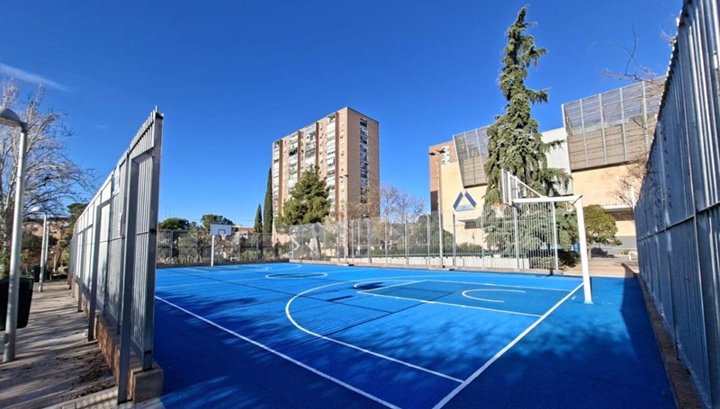 Para la rehabilitación del suelo de las pistas deportivas, se ha colocado hormigón poroso sobre el existente, mejorando la evacuación del agua mediante pendientes hacia el parque adyacente y se ha instalado nuevo pavimento de adoquín en los accesos a la pista 1 junto a la travesía de Vázquez de Mella, anteriormente situada sobre terrizo. También se ha incorporado un área para los mayores entre la pista 1 y el pasillo central con elementos biosaludables y se han mejorado las rampas con pavimento de terrazo granítico.