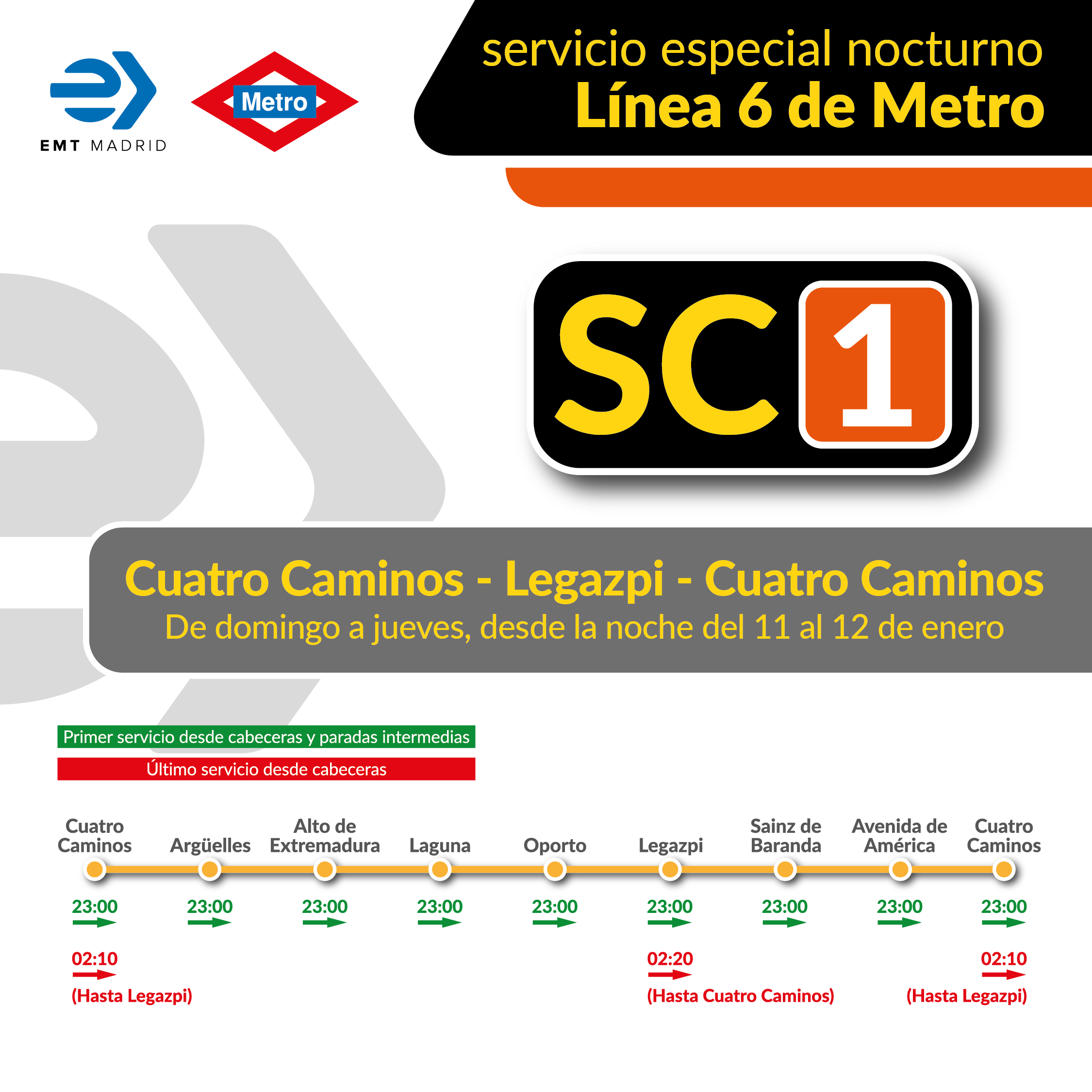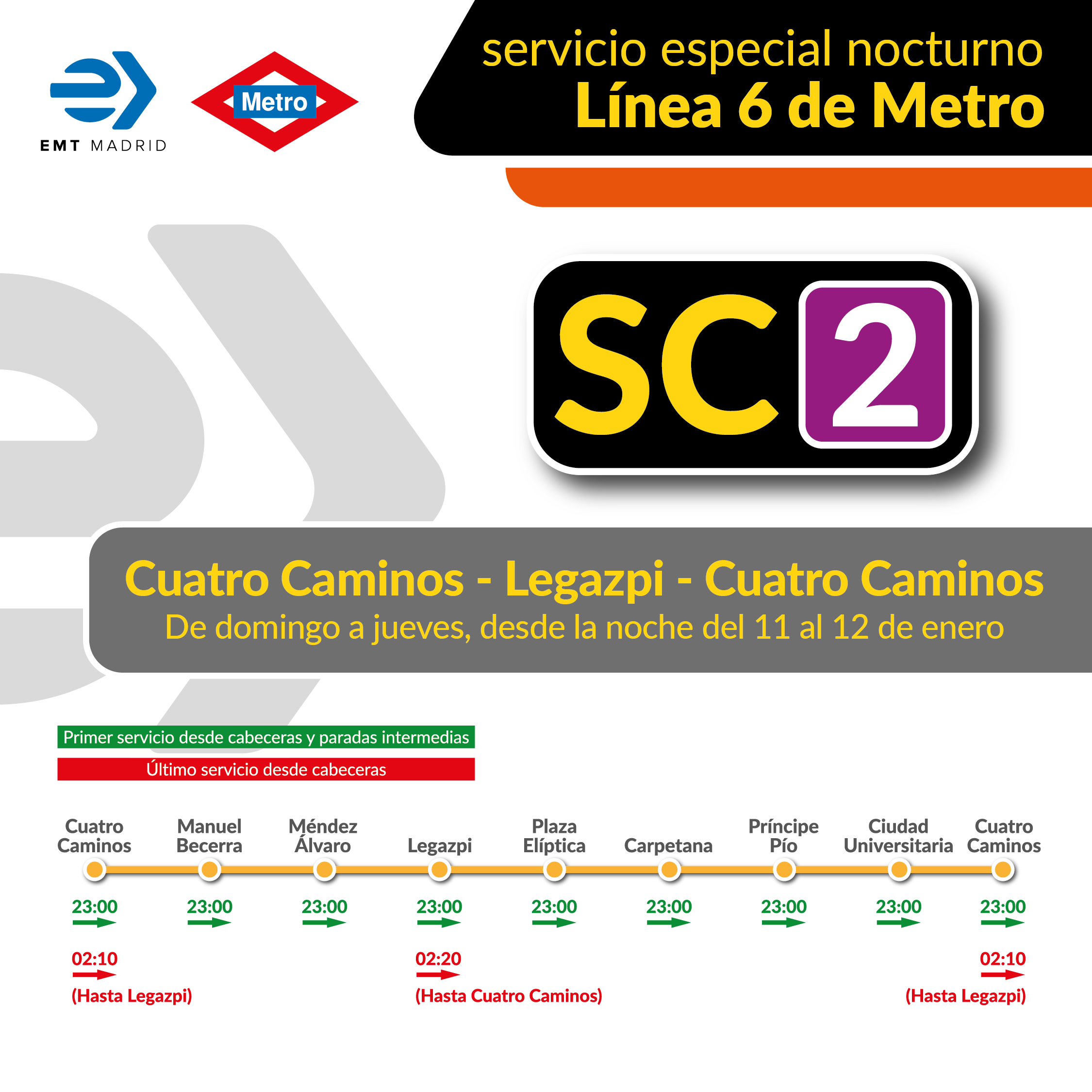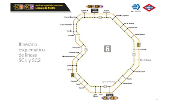 Constará de dos líneas, el SE Circular 1 (SC1) y el SE Circular 2 (SC2), que recorrerán de manera circular los trayectos entre Cuatro Caminos y la plaza de Legazpi. Este servicio especial estará operativo en los días de cierre nocturno de Metro, de domingo a jueves, incluyendo festivos y vísperas de festivos.