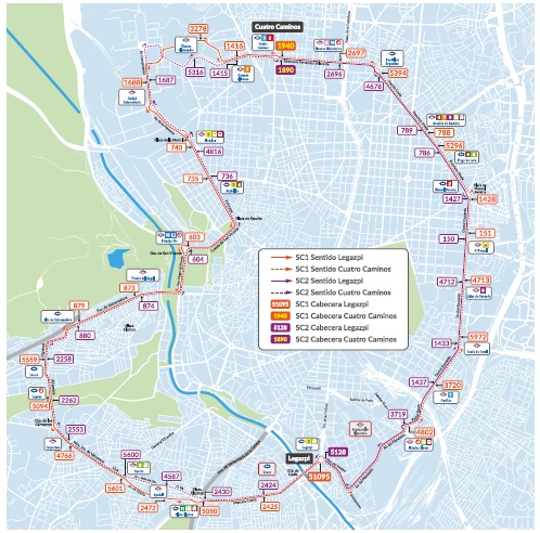 Estará dotado con 28 autobuses (14 por sentido). La SC1 circulará en el sentido contrario a las agujas del reloj entre Cuatro Caminos y plaza de Legazpi/plaza de Legazpi y Cuatro Caminos, mientras que la SC2 hará el trayecto en el sentido horario con los mismos recorridos.