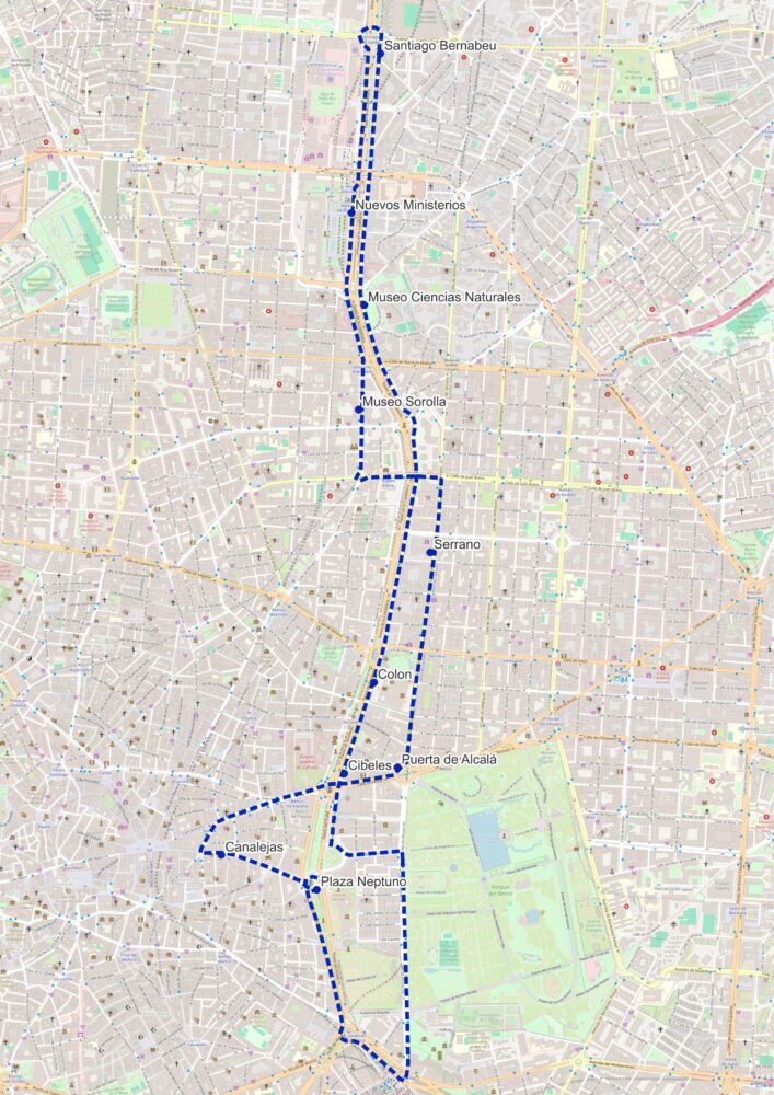 – 10 paradas: plaza de Neptuno, Cibeles, Colón, Museo de Ciencias Naturales, Santiago Bernabéu, Nuevos Ministerios, Museo Sorolla, Serrano, Puerta de Alcalá y Canalejas.