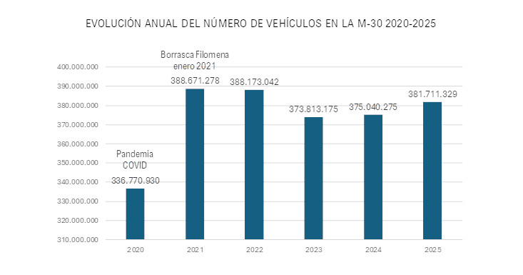En datos acumulados, desde el año 2000 hasta 2025, la M-30 suma un total de 2.244 millones de desplazamientos.