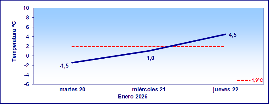 Este lunes, 19 de enero, se han registrado mínimas de -0,1ºC. De cara al martes, 20 de enero, las temperaturas mínimas bajarán hasta los -1,5ºC, subiendo fuertemente hasta los +1,0ºC de cara al miércoles y21 a los 4,5ºC de cara al jueves, 22 de enero. El nivel de alerta se alcanza cuando las temperaturas mínimas previstas para al menos uno de los próximos tres días sean inferiores a 2º, lo que se comunica a los efectos de aplicar las medidas de prevención e información oportunas en el ámbito de sus competencias.