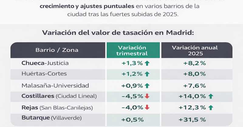 El estudio se ha elaborado a partir del análisis del valor de tasación de viviendas en Madrid capital, comparando la variación trimestral más reciente del 4º trimestre de 2025 con la variación anual acumulada durante 2025. Los datos reflejan valores técnicos de tasación y no precios de oferta publicados en portales inmobiliarios.