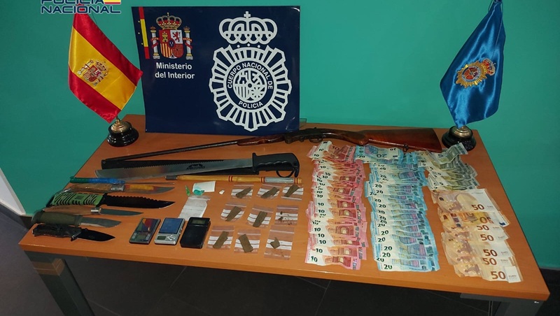 En fecha 3 de febrero, se efectuó una entrada y registro en dos domicilios, con el apoyo del Grupo Especial de Operaciones (GEO) para la apertura y aseguramiento de las viviendas. Entre los efectos intervenidos, se obtuvieron cerca de 1.900 euros en efectivo, un arma de fuego, varias armas blancas prohibidas de grandes dimensiones, dosis de hachís, cocaína y marihuana ya preparadas para su venta, así como básculas de precisión para elaborar y distribuir sustancias estupefacientes.