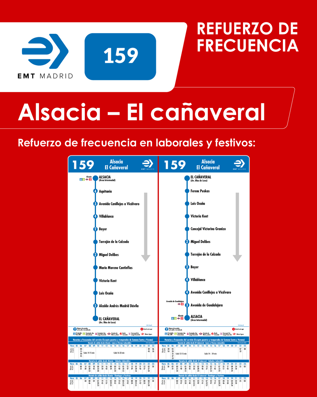 Por motivos similares, pero centrados en el desarrollo urbano de El Cañaveral, que ya supera los 22.000 residentes, la línea 159 incorporará un autobús adicional en laborables y sábados. Este refuerzo da continuidad a la reciente prolongación de la línea por el interior del barrio y al incremento de oferta de la línea E5, que también presta servicio en esta zona, actuaciones ambas aplicadas a finales de 2025.