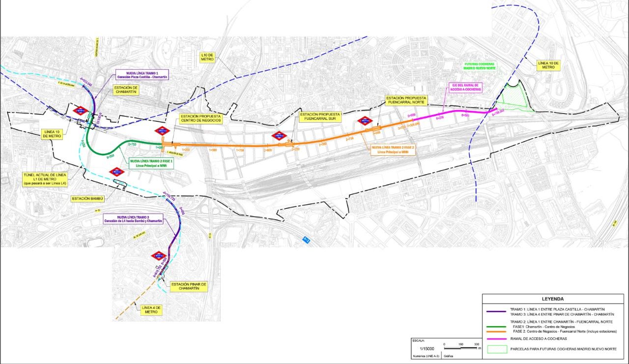 Por su parte, la quinta se plantea como una prolongación de la L1 hacia el norte, donde el tramo Pinar de Chamartín-Bambú-Chamartín de la actual Línea 1 pasaría a formar parte de la L4. En este sentido, el nuevo trazado partiría desde la intersección del Paseo de la Castellana y la calle Sinesio Delgado. En todos los casos, se incluye un ramal de enlace con las futuras cocheras, que ya se encuentran en fase de licitación para la redacción del proyecto, y que darán servicio a esta zona de la capital.